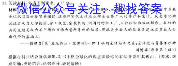 33.阅读材料,完成下列要求。(12分)材料在乔治城大学校园内,100名左右的学生在集会,他们认为公司、全球化、国际货币基金组织以及世界贸易组织,这些坏家伙无情地压榨全世界工人的尊严和生计。反全球化的抗议者来自大学校园、劳工联盟、宗教机构、例闭的纺织工厂、人权组织和非洲棉农。抗议的共同主题是权力不平衡和市场力量所导致的结果,那就是少数人的收益是建立在多数人付出代价的基础上。——摘编自[美]皮厄特拉·里佛利《一件T恤的全球经济之旅:全球化与贸易保护的新博弈(原书第2版)》根据材料并结合所学知识,对书中反全球化的观点谈谈你的看法并说明其理由。(要求:观点明确,史论结合,论据充分,表述清晰)