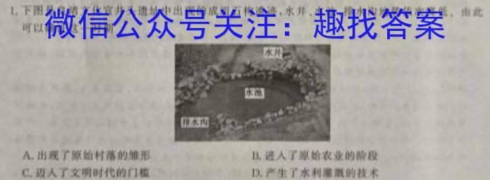 1.下图是良渚文化官井头遗址中出现的成组石构遗迹,水井、水池、排水沟地势依次降低,由此可以确证这一时期A.出现了原始村落的雏形B.进人了原始农业的阶段C.迈人了文明时代的门槛D.产生了水利灌溉的技术